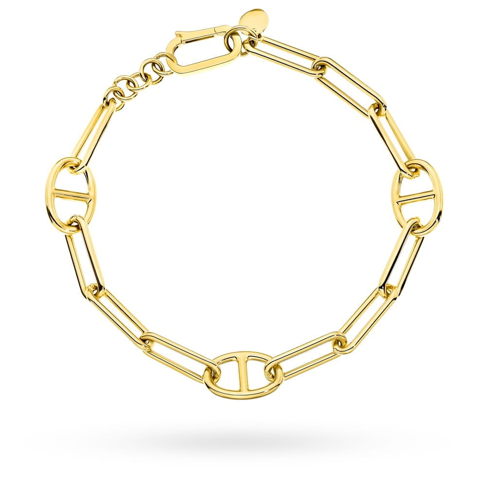 Bransoletka o długości 17 cm wykonana z żółtego złota próby 585. Jest to model pusty, co zapewnia lekkość i wygodę noszenia. Wzór składa się z owalnych i okrągłych elementów, które nadają biżuterii nowoczesny wygląd. Każde ogniwo ma szerokość 4,50 mm i długość 14 mm, natomiast owalny element mierzy 8,50 mm szerokości i 13 mm długości. Całość waży 4,66 g, co sprawia, że bransoletka jest delikatna, ale jednocześnie elegancka i efektowna.
