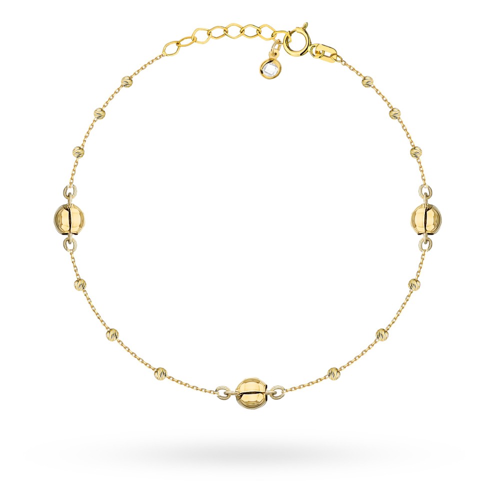 Bransoletka wykonana z żółtego złota próby 585, wyróżniająca się pełnym wzorem kuleczek z delikatnym akcentem kamienia. Długość bransoletki wynosi 22 cm z możliwością regulacji o dodatkowe 3 cm, co pozwala na idealne dopasowanie do nadgarstka. Ozdobne elementy w postaci kuleczek mają średnicę 2,10 mm (mała kuleczka) oraz 4,00 mm (duża kuleczka), nadając biżuterii lekkości i eleganckiego charakteru. Obecność kamienia dodaje subtelnego blasku, podkreślając wyjątkowość tej delikatnej kompozycji. To doskonały dodatek, który uzupełni zarówno codzienne, jak i bardziej wyjściowe stylizacje.