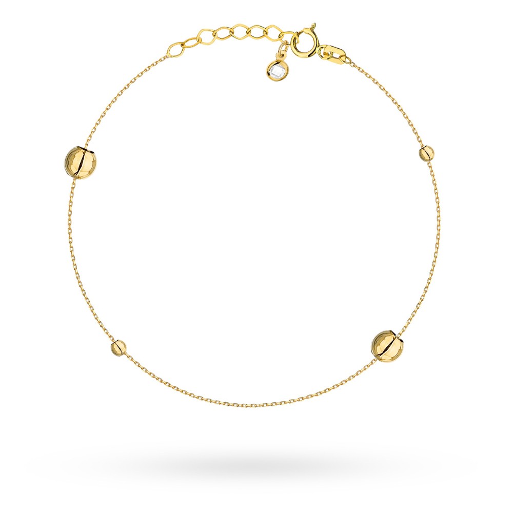 Bransoletka wykonana z żółtego złota próby 585, wyróżniająca się eleganckim wzorem w formie kul z subtelnym akcentem kamienia. Długość bransoletki wynosi 12 cm z możliwością regulacji o dodatkowe 3 cm, co pozwala na idealne dopasowanie do nadgarstka. Ozdobne elementy w postaci kulek o średnicy 2,5 mm (mała kulka) i 4,0 mm (duża kulka) nadają kompozycji lekkości i nowoczesnego wyrazu. Obecność kamienia dodaje biżuterii delikatnego blasku i elegancji. To wyjątkowy dodatek, który doskonale uzupełni codzienne oraz bardziej wyrafinowane stylizacje.