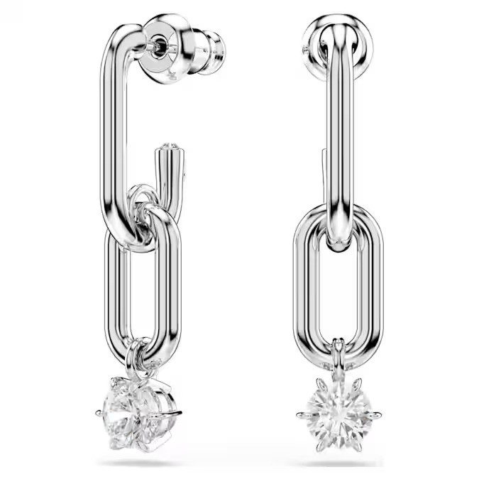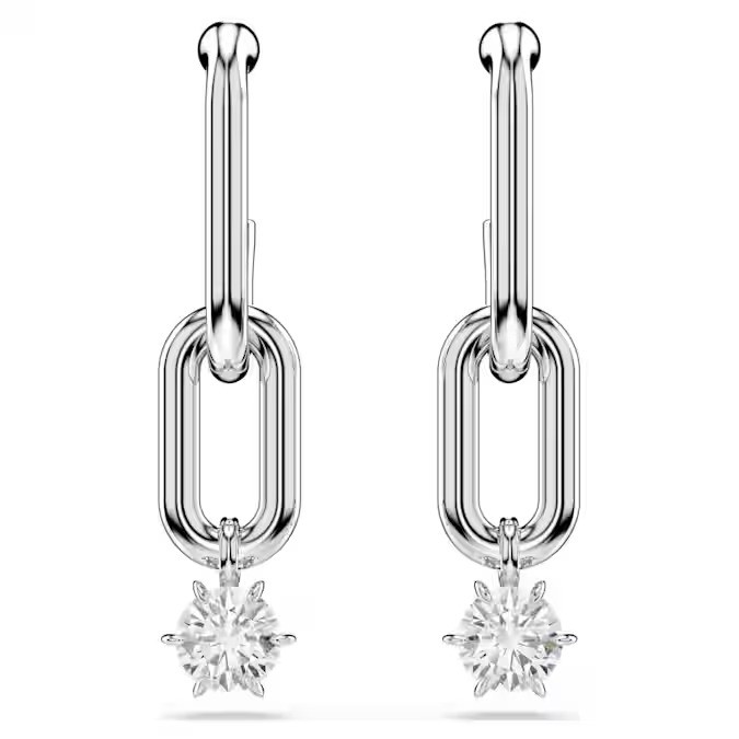 Te zabawne kolczyki to idealny wybór do nieoczekiwanych stylizacji. Każdy element składa się z dwóch połączonych ogniw z rodowanego srebra, z delikatnie osadzoną cyrkonią Swarovskiego, która delikatnie zwisa pod spodem. To elegancki, metaliczny wygląd na każdą okazję, z dodatkowym blaskiem Swarovskiego.