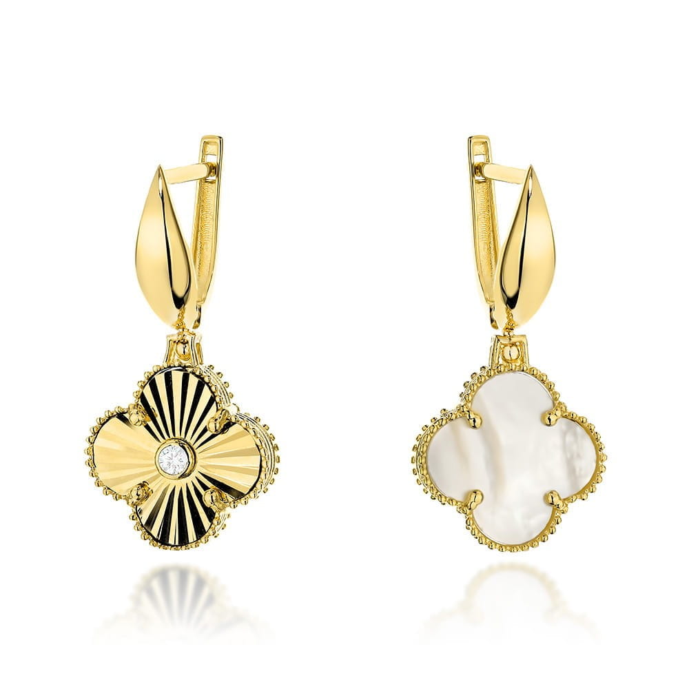 Kolczyki złote dwustronne koniczynki z masą perłową