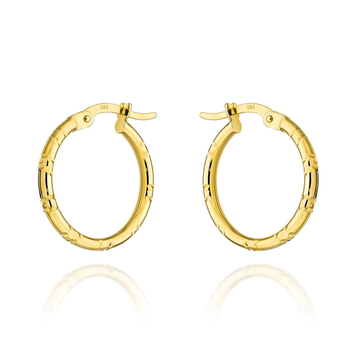 Te urocze kolczyki to wyjątkowe połączenie prostoty i elegancji. Wykonane z najwyższej jakości złota próby 585, prezentują delikatne kółka o średnicy 17 mm, które są nacinane, co nadaje im subtelny detal. To biżuteria, która z łatwością dopasuje się do różnych stylizacji i podkreśli Twój gust.
