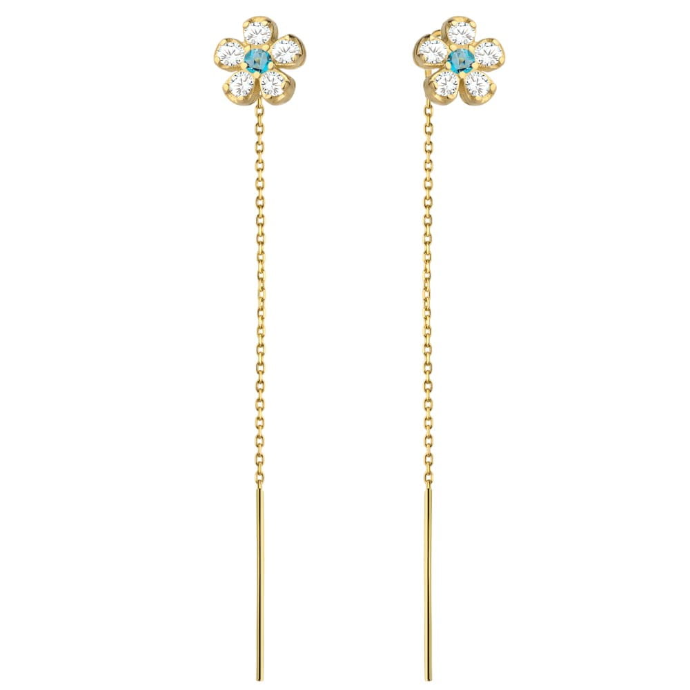 Kolczyki złote przewlekane kwiatki z niebieską cyrkonią