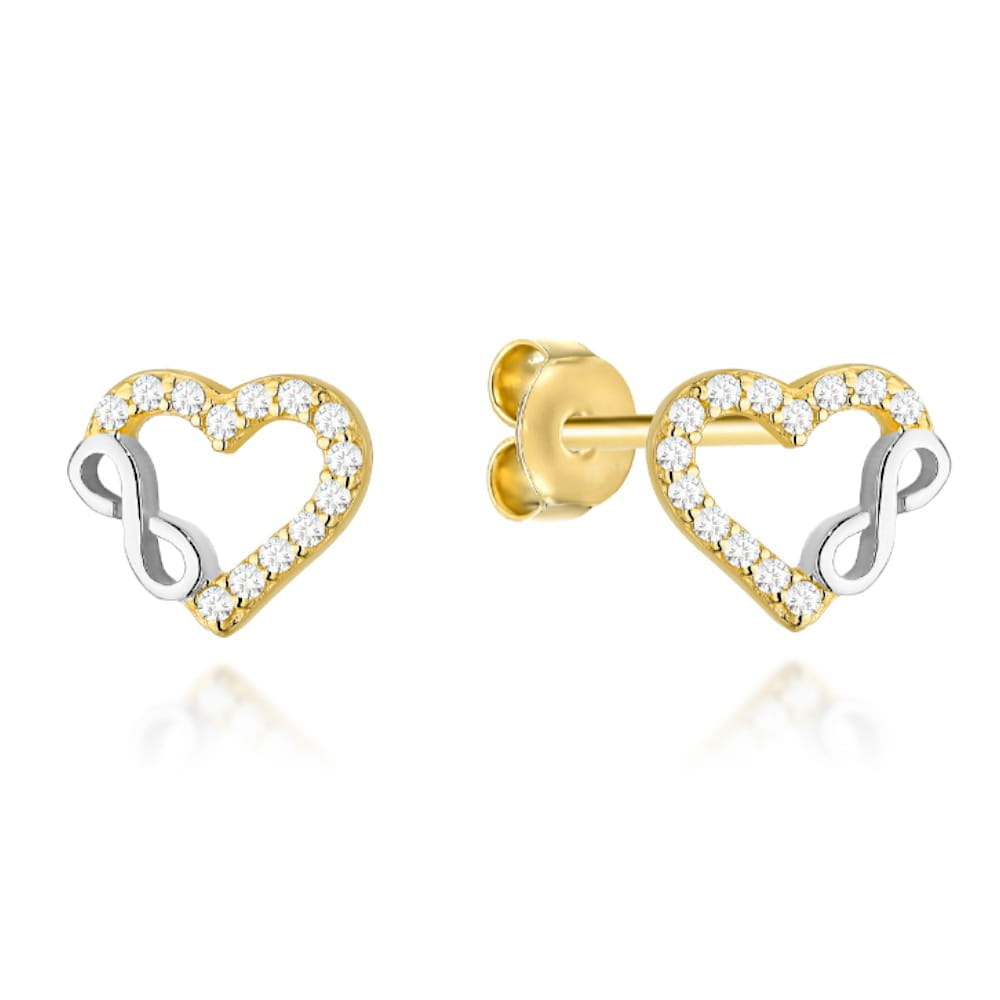 Kolczyki złote serce, nieskończoność w białym złocie i cyrkonie
