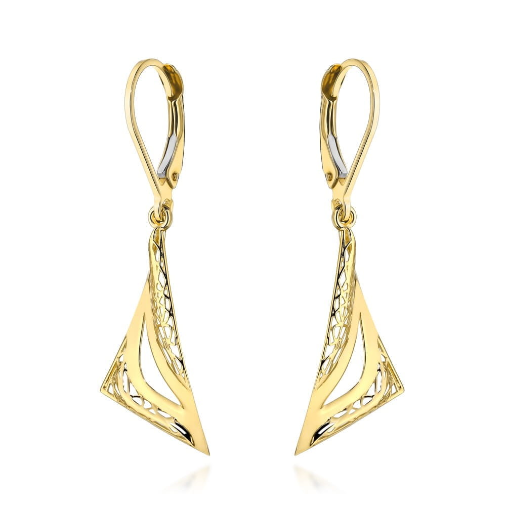 Zapięcie w stylu angielskim zapewnia łatwe noszenie, a materiał z najwyższej próby złota (585) gwarantuje trwałość i niezwykły blask. Kolczyki prezentują trójkątny wzór, nadając im unikalny, dynamiczny wygląd. Ich długość całkowita wynosi 35mm, a szerokość zmienna od 2,60 do 12mm, co czyni je doskonałym dodatkiem do każdej stylizacji.