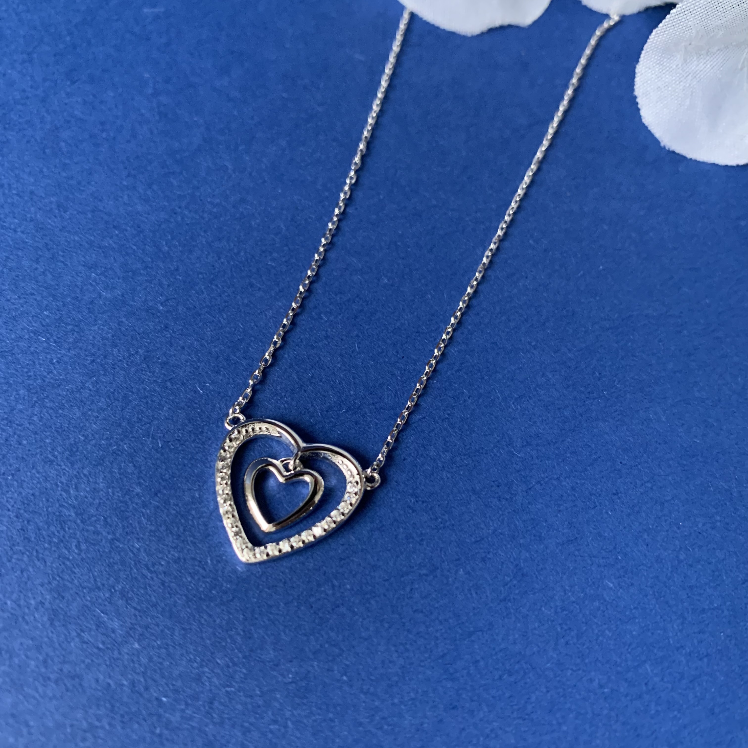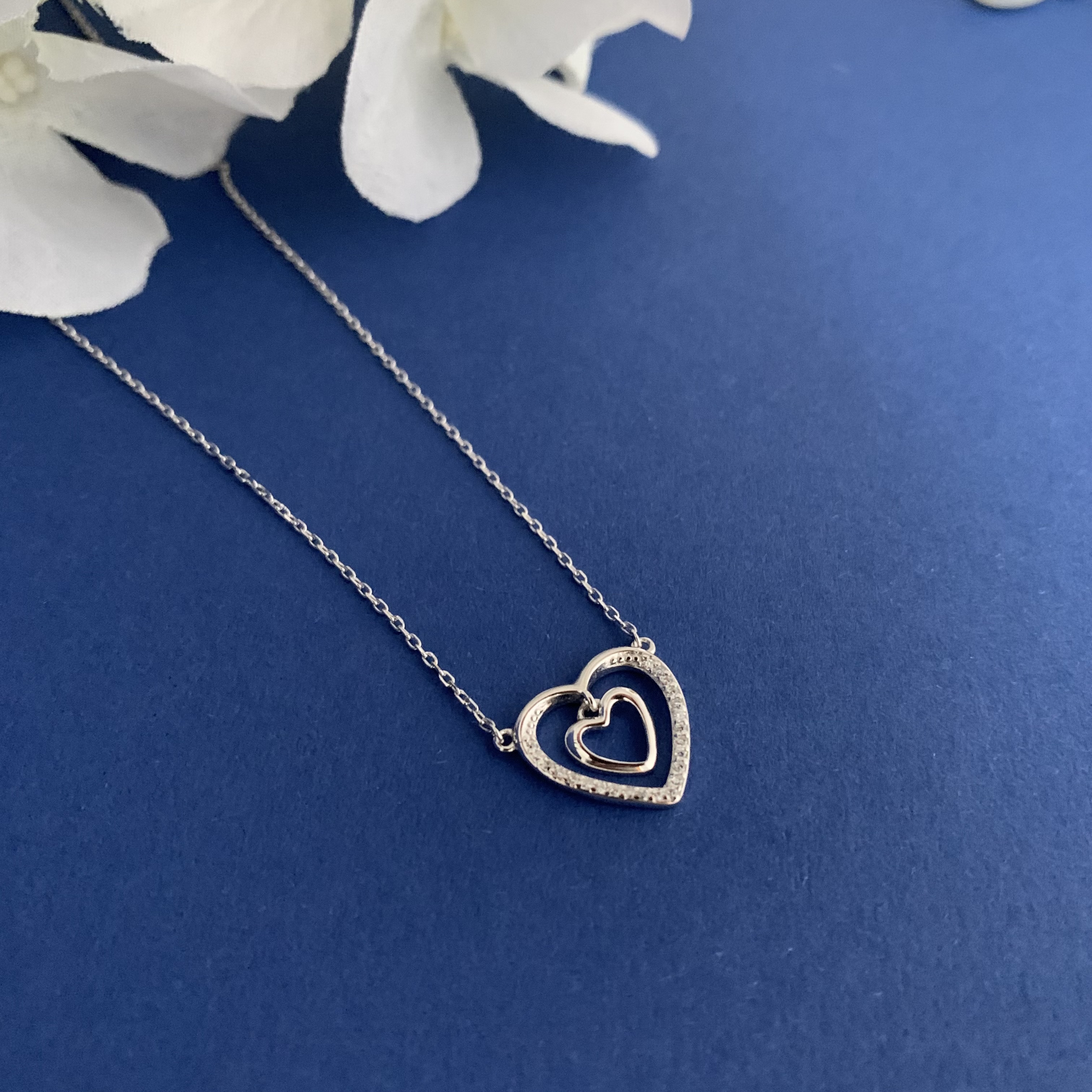 Centralnym elementem naszyjnika są dwa serca — większe z nich zostało efektownie przyozdobione lśniącymi białymi cyrkoniami, które nadają całości eleganckiego blasku. Mniejsze serce subtelnie dopełnia kompozycję, symbolizując miłość, bliskość i więź.