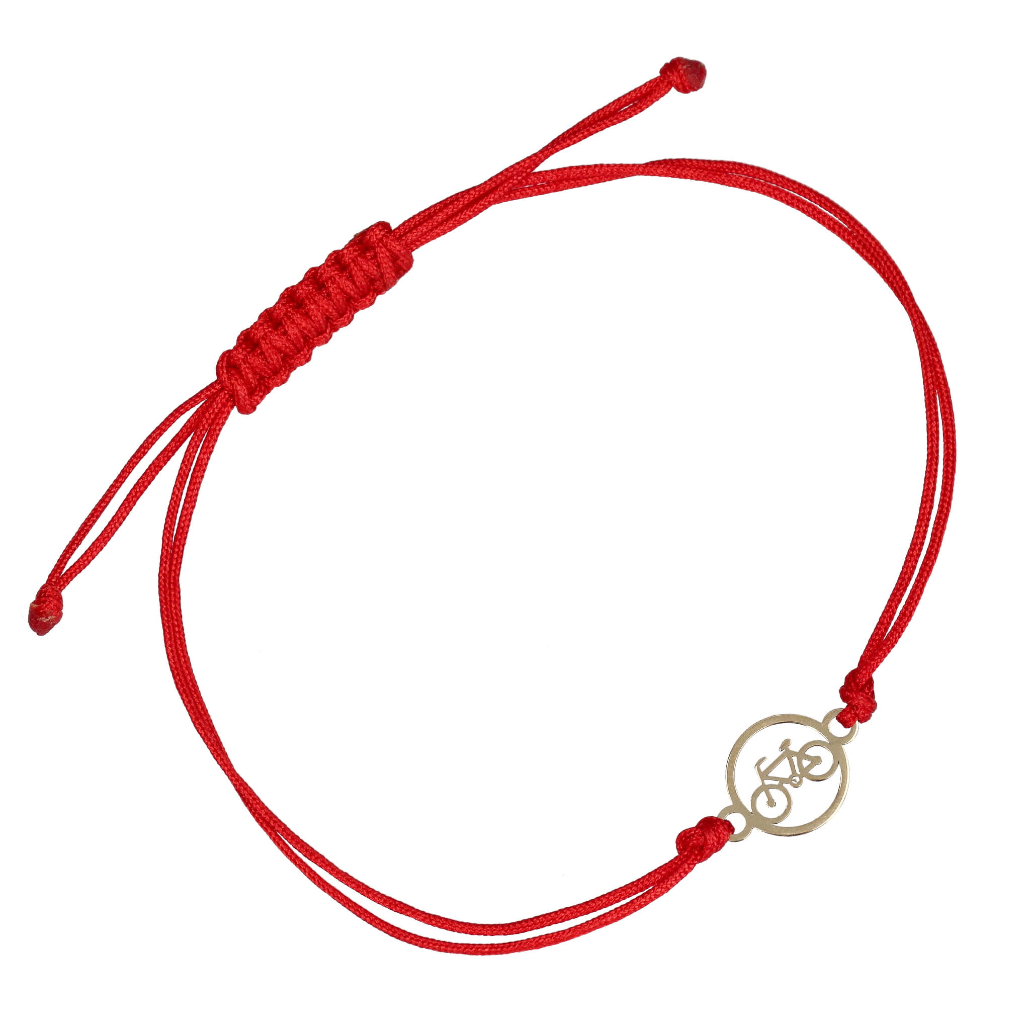 Bransoletka AM-B143 to połączenie wysokiej jakości czerwonego sznurka ze złotym minimalistycznym detalem w kształcie roweru w kółku próby 585. Ta wyjątkowa bransoletka w typie celebrytki jest w pełni regulowana dzięki ściąganym sznurkom i stanowi doskonały wybór na prezent dla każdej cenionej osoby. Jest to idealny akcent biżuteryjny, który ozdabia kobiecy nadgarstek.